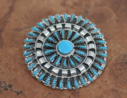 A beautiful Navajo Native American Cluster Pin. It is made from sterling silver and man made turquoise. It is about 2" in diameter.