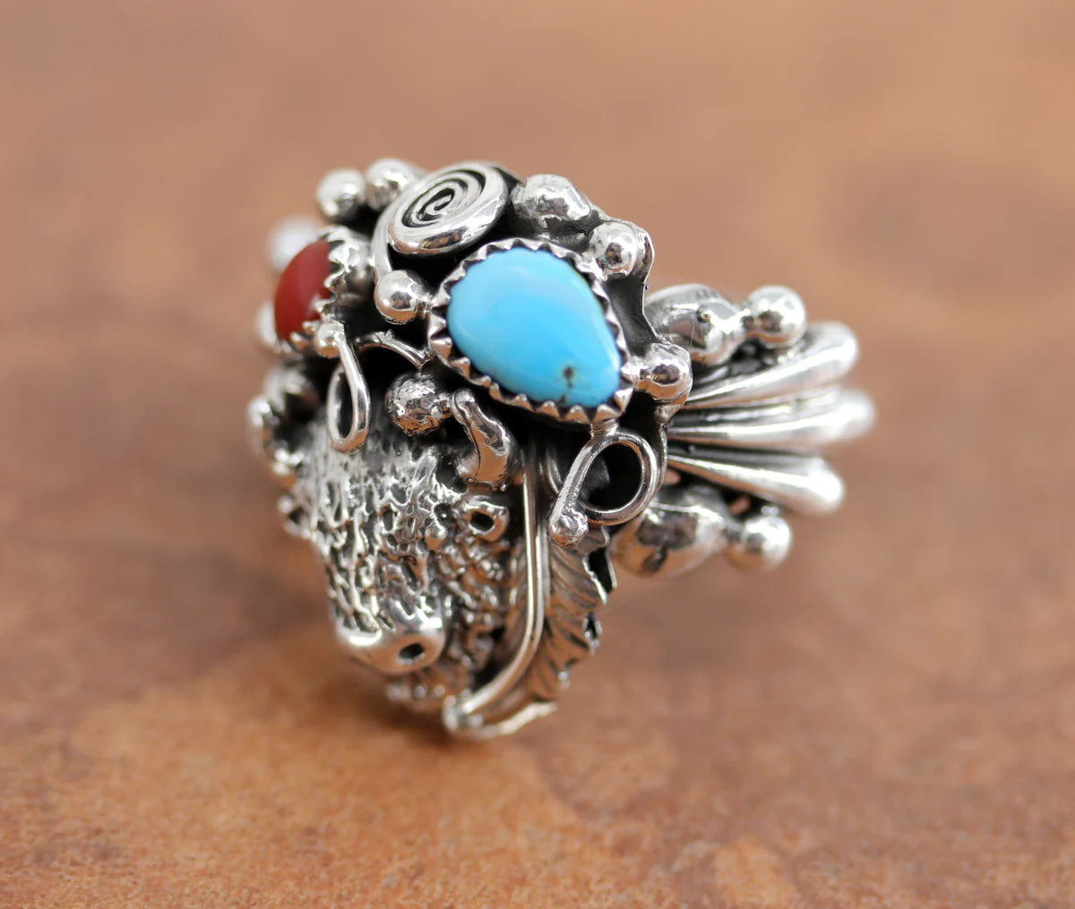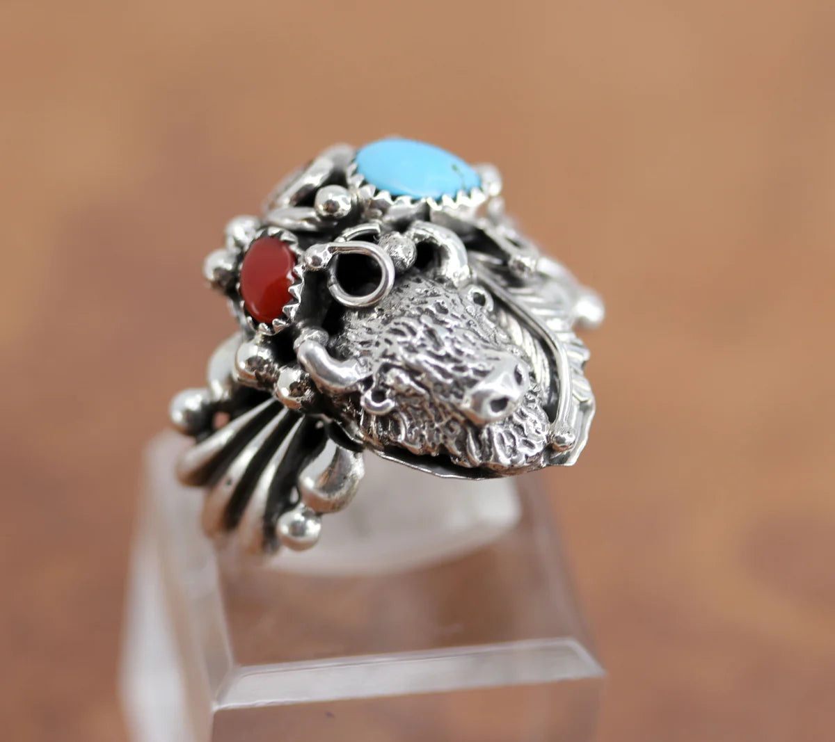 Sterling Silver Navajo Turquoise Coral Bull Ring Size 12