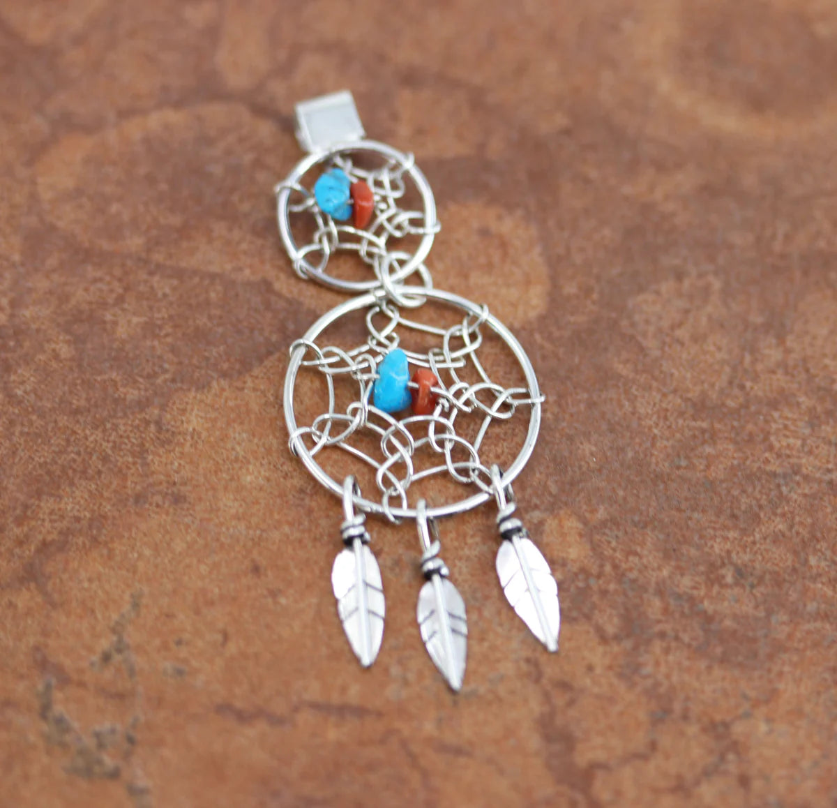 Sterling Silver Navajo Turquoise Coral Dream Catcher Pendant