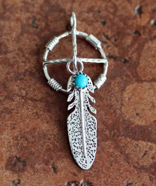Beautiful Navajo Native American Dream Catcher pendant by Sharon McCarthy. It is made from sterling silver and turquoise. The pendant is about 1 1/2" in length including the bail and 3/4" in width.