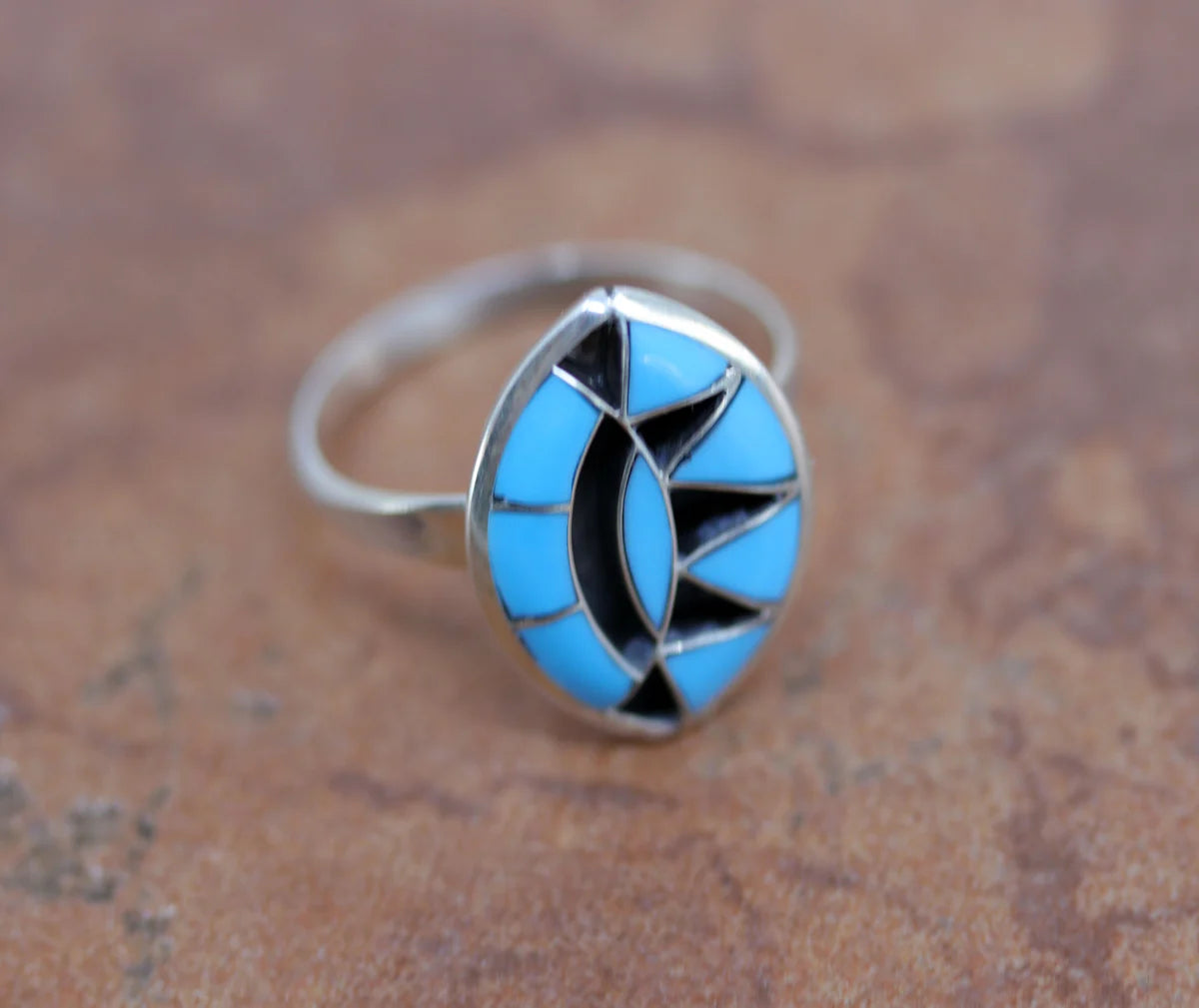 Lovely Zuni Native American ring. It is made from sterling silver and turquoise. The ring size 5 1/2 and it is 3/4" in length. The parts that appear black are cut outs with oxidized silver.