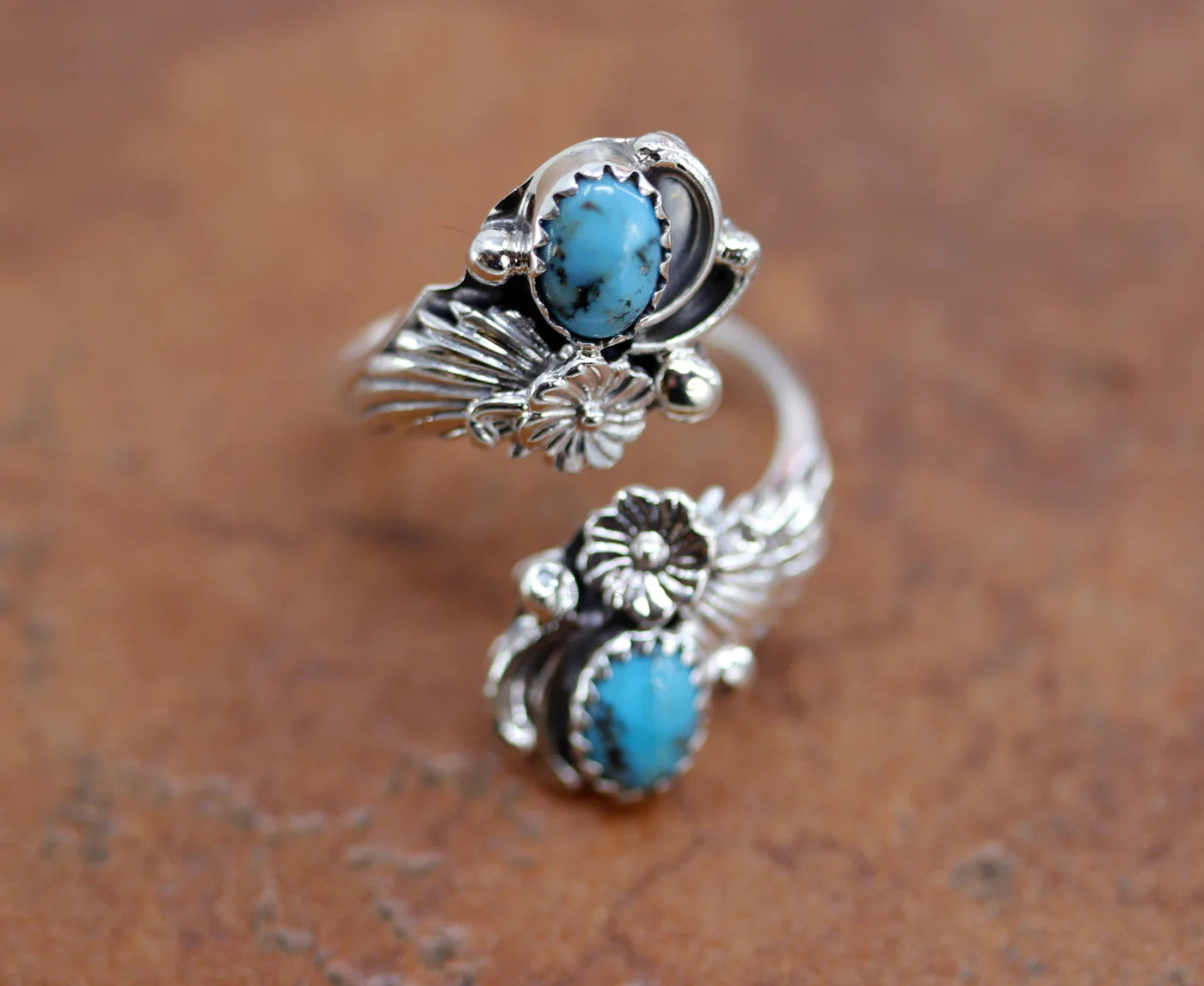 A beautiful Navajo Native American ring. It is made from sterling silver and turquoise. The size is adjustable so it can fit sizes 6-9, and it is 1 1/2" at the widest point.