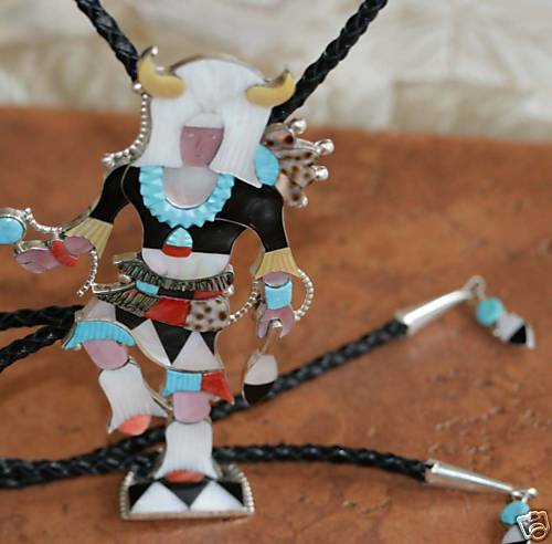 Beautiful Zuni Native American Bolo Tie and Tie Tack. The bolo tie is made of sterling silver and multi-stone inlay. The cord is about 38". The bolo measures 5 3/4" by 3 3/8". It can be worn as a bolo or pendant and it comes with a stand. The dancer is holding the tie tack and it can be removed. It is stamped Beyuka.