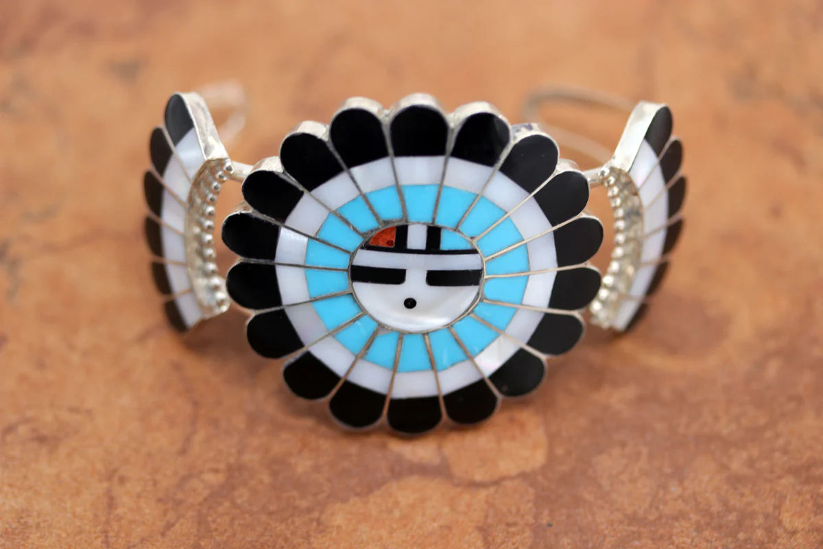 Authentic Zuni Native American bracelet by V Booqua. It is made from sterling silver, coral, turquoise, onyx, and mother of pearl. It is about 5 3/4" around and about 2" wide at the widest point. The opening is about 1".