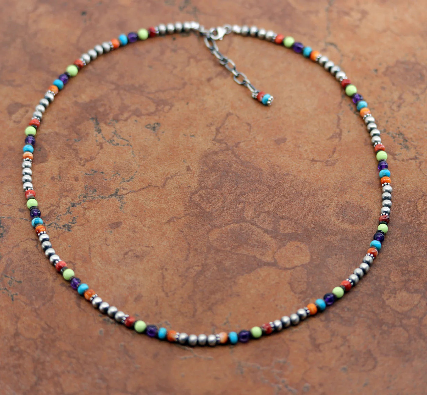 A beautiful silver Navajo Native American multi-stone necklace. The necklace is 20" in length (18" plus 2" extender) and the beads measure about 3/8".