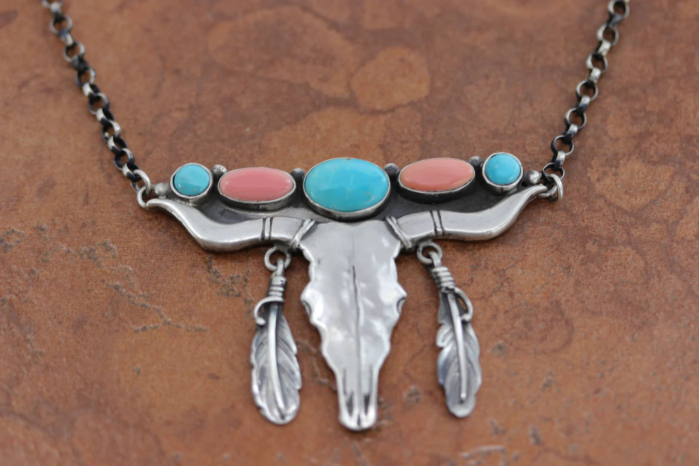 Sterling Silver Necklace Bull Turquoise Coral Necklace