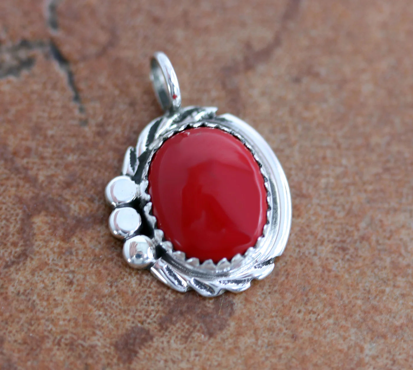 Beautiful Navajo Native American Pendant. It is made from sterling silver and man made coral. It is 5/8" in width and 1" in length including the bail.