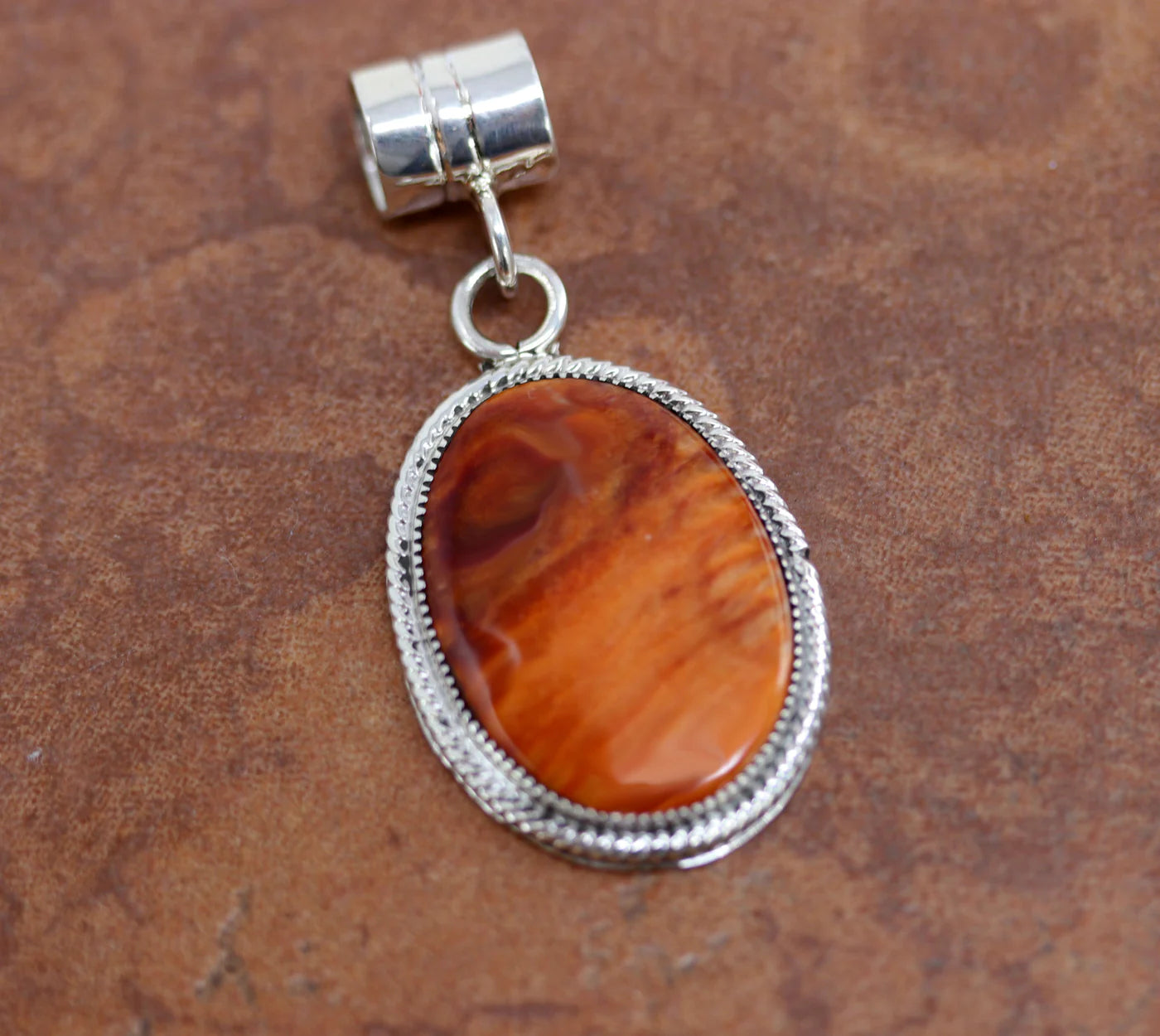 Beautiful Navajo Native American Pendant by Greg Yazzie. It is made from sterling silver and spiny oyster. It is 2 1/8" long and about 1" wide.