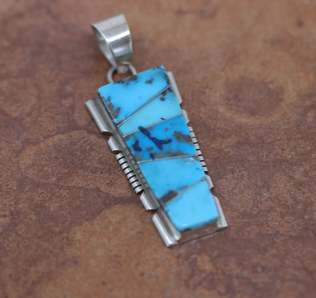 A beautiful Navajo Native American Pendant. It is made from sterling silver and turquoise. It is 1" in width and 2 1/2" in length including the bail.