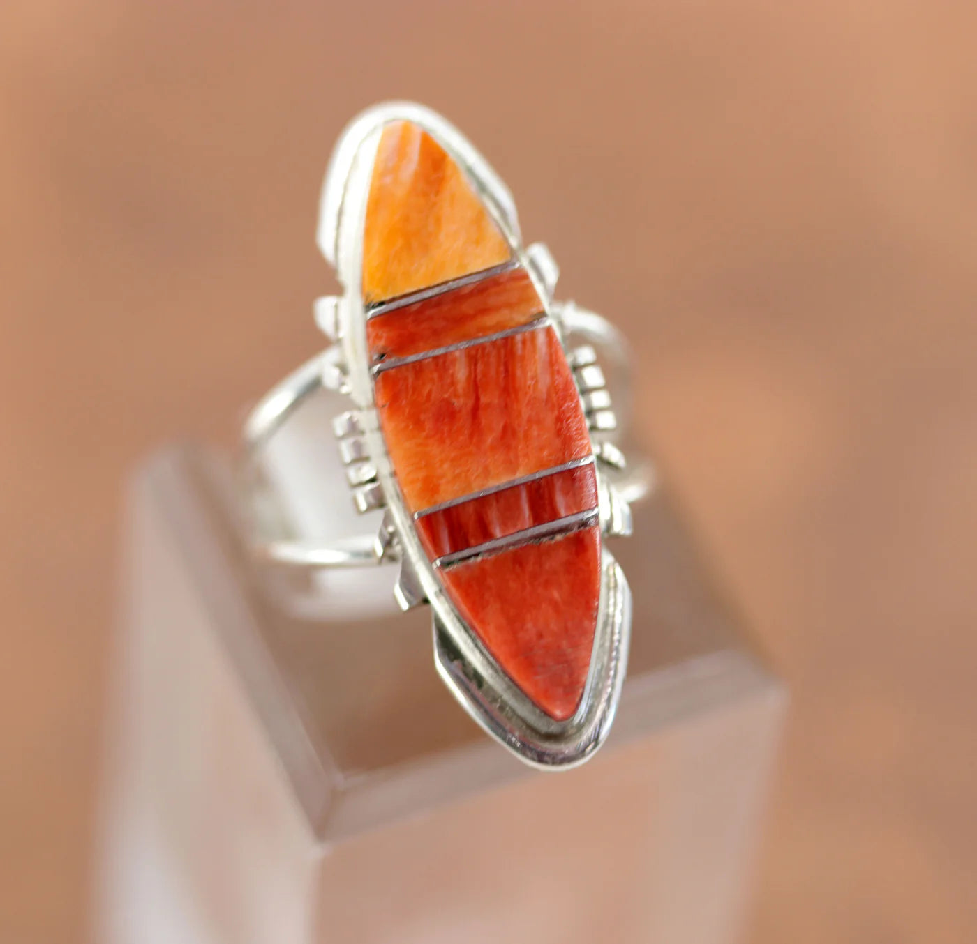 Beautiful Navajo Native American ring. It is made from sterling silver and spiny oyster. The ring size 9 and it is 1 3/8" in length.