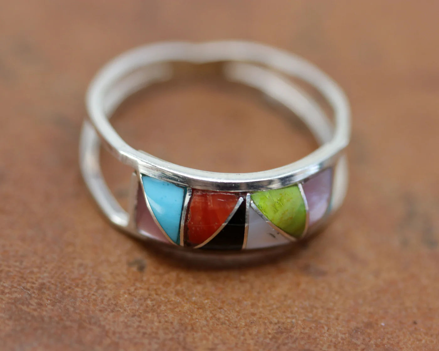 Beautiful Zuni Native American ring. It is made from sterling silver and multi-stone inlay. The ring size 6 and it is 1/4" in length.