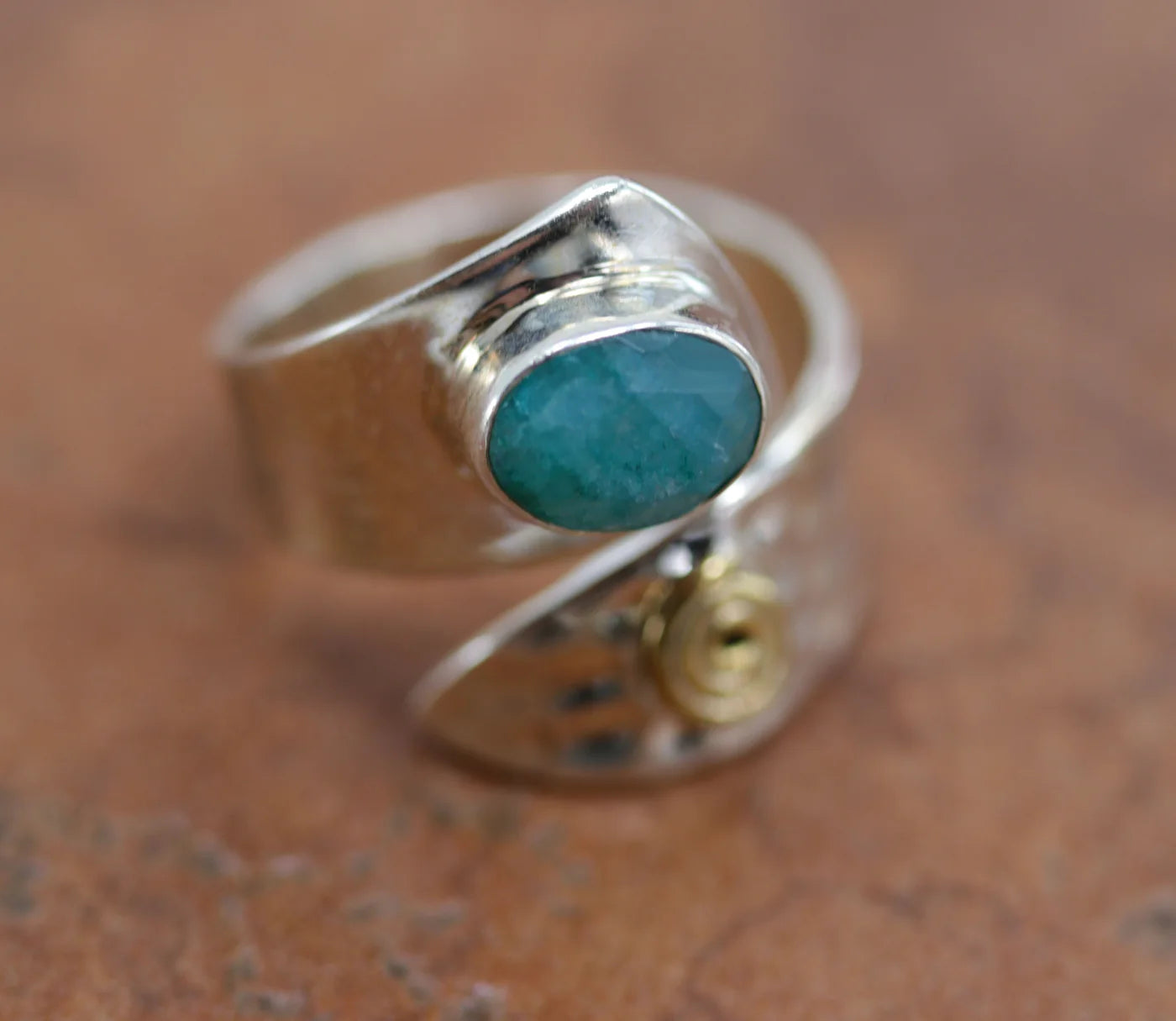A beautiful Southwest Style gemstone ring made from sterling silver and emerald. The ring size is adjustable and fits sizes 7 to 8 and it is 1" in length.
