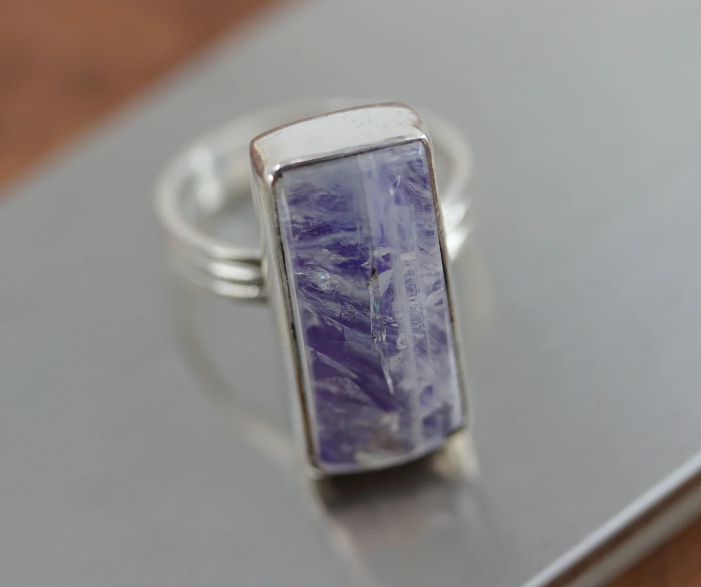 A beautiful Southwest Style gemstone ring made from sterling silver and lavender quartz. The ring size is 8 and it is 1" in length.