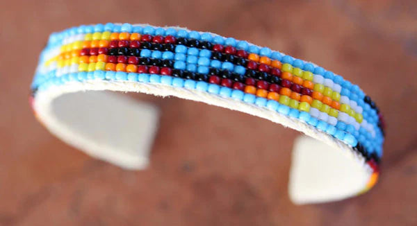 Beautiful Navajo Native American Indian bracelet. It is made from leather and multi-colored beads. It is about 5 3/8" around (not including the opening) and 1/2" wide. The opening is 1 1/4", and it is partly flexible.