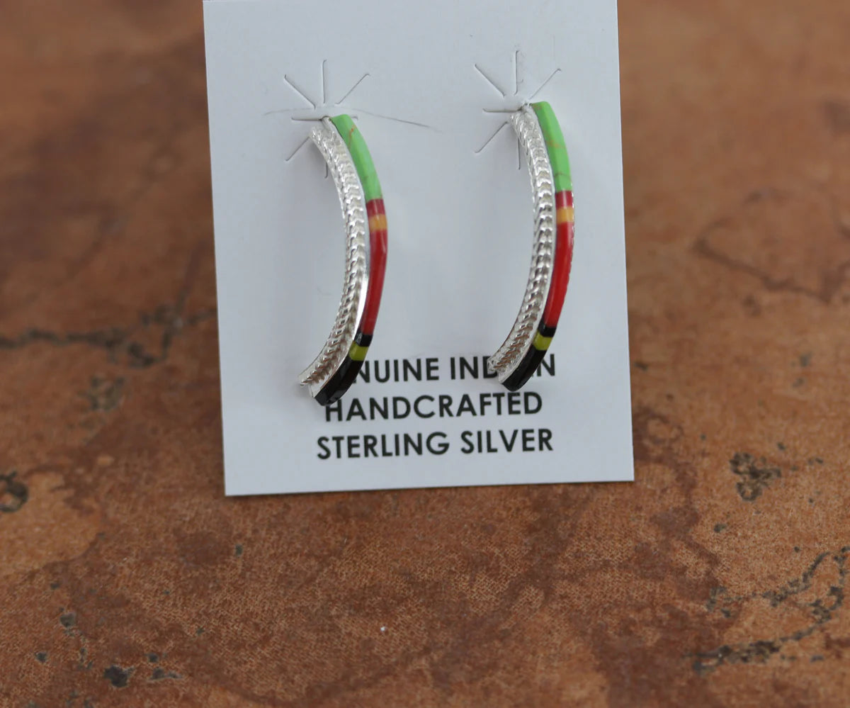 Beautiful Zuni Native American earrings. They are made from sterling silver and various stones. Each earring is 1 3/8" in length, and about 3/16" in width.