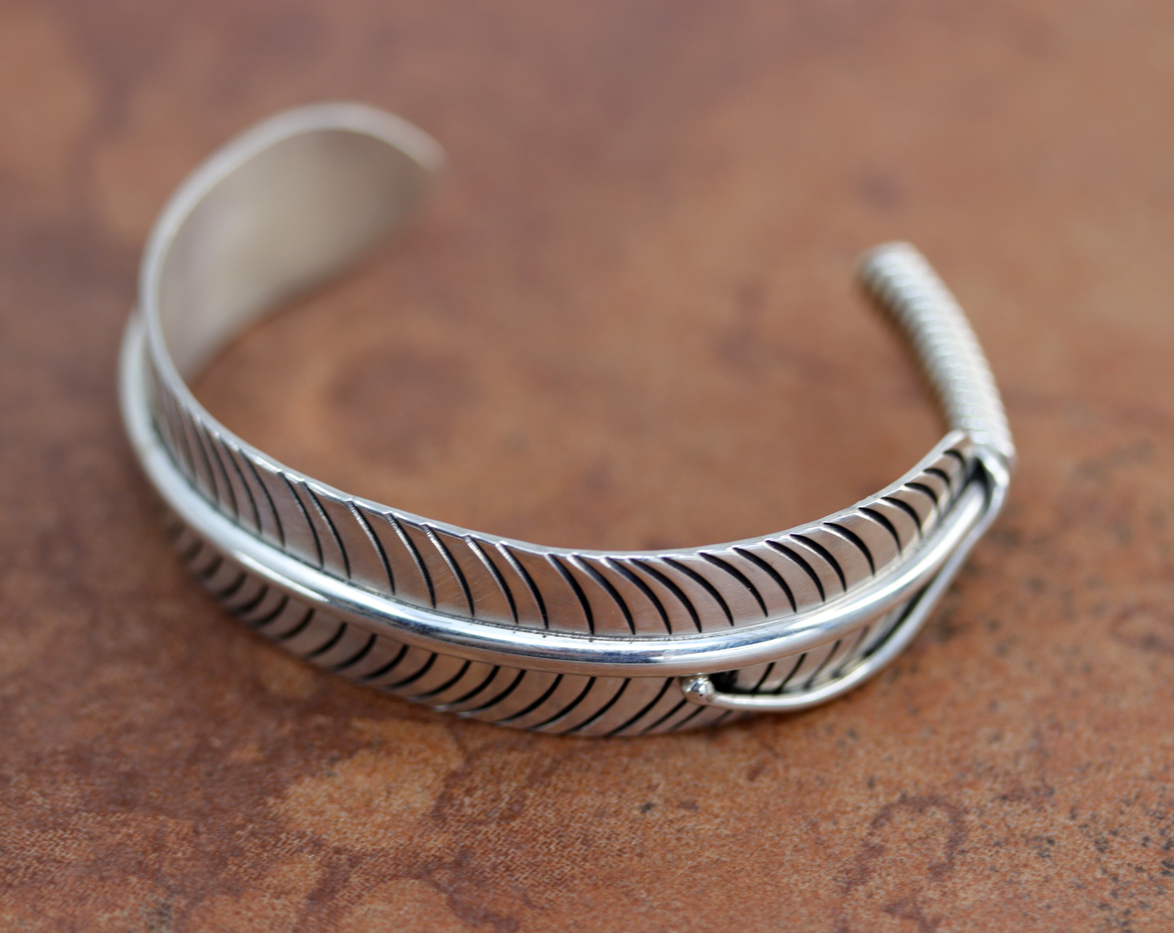 A beautiful Navajo Native American bracelet. It is made from sterling silver. It is about 5 1/4" around and about 5/8". The opening is about 1 1/4" and partly flexible.