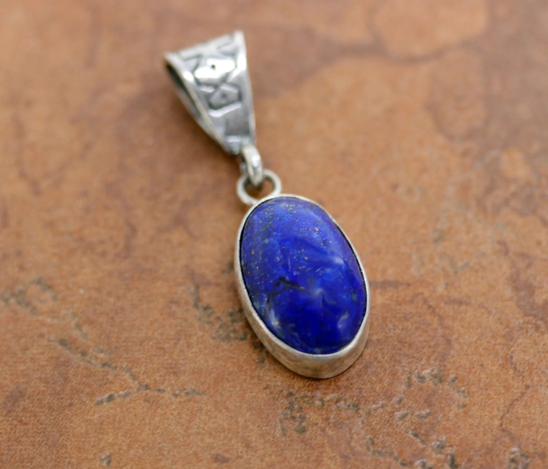 A lovely Navajo Native American pendant. It is made from sterling silver and lapis. The pendant measures 1 3/4" by 5/8".