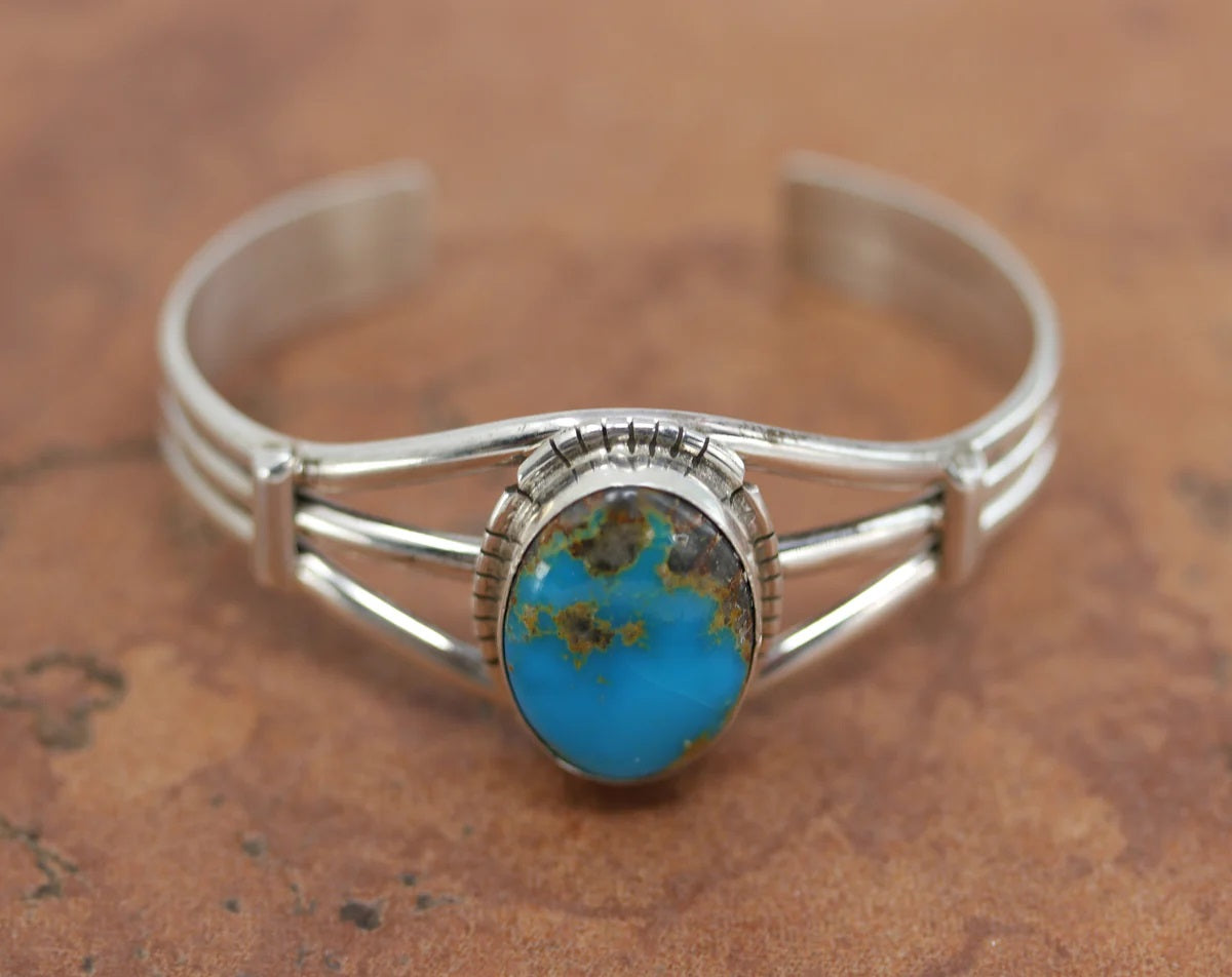 Beautiful Navajo Native American bracelet. It is made from sterling silver and turquoise. It is about 5 1/4" around and 1 1/8" wide. The opening is about 1" and partly flexible.