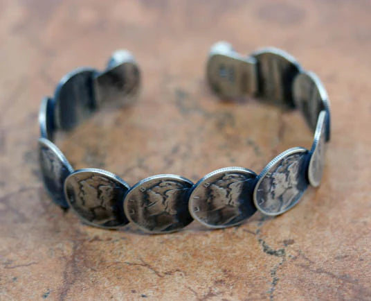 A beautiful Native American bracelet by McCabe. It is made from sterling silver, real mercury dimes, and turquoise. It is about 6 1/2" in length, not including the opening, and it is about 5/8" wide. The opening is 1" and partly flexible.