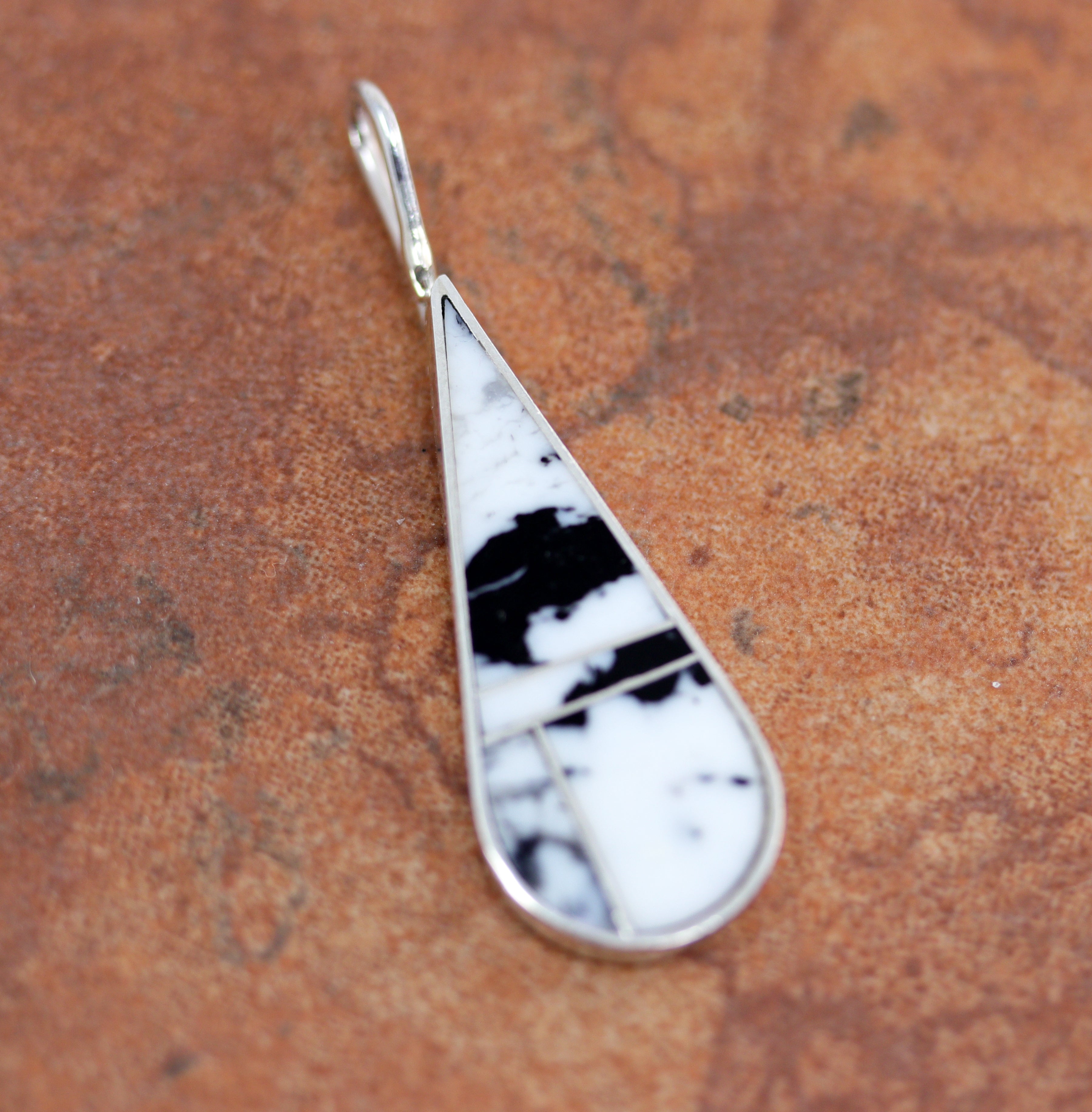 A beautiful Navajo Native American pendant made from sterling silver and white buffalo. The pendant measures about 1 7/8" by 5/8".