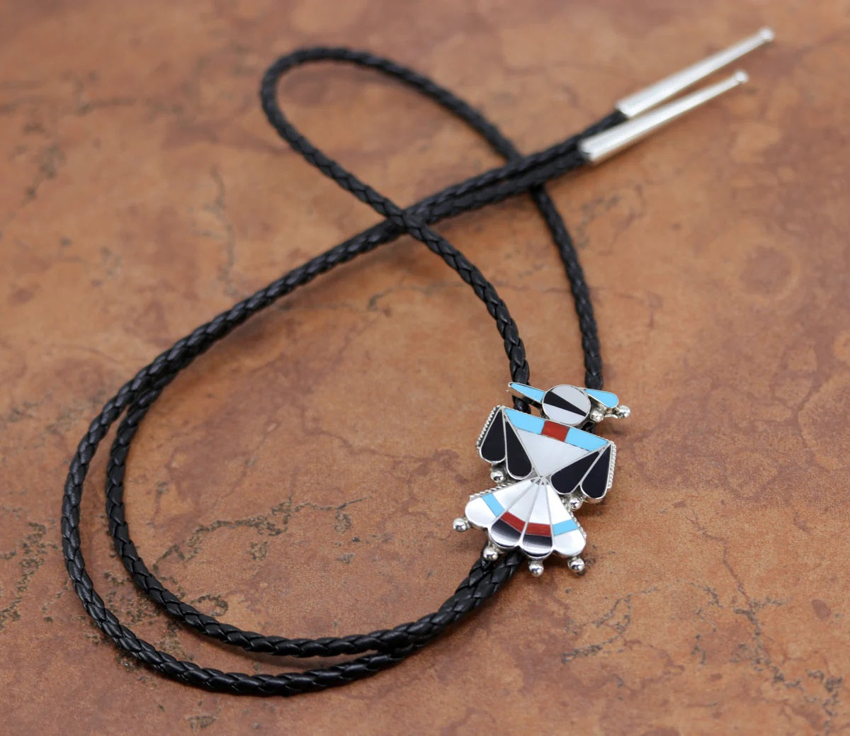 Authentic Zuni Native American Bolo Tie. The bolo tie is made of sterling silver mother of pearl, onyx, coral, turquoise, and more. The cord is about 38". The bolo measures 1 7/8" by 1 1/4".
