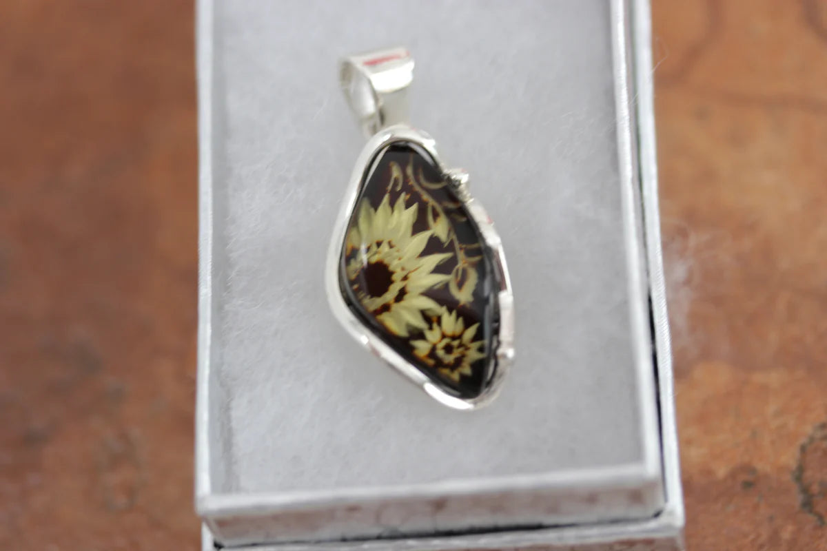 Sterling Silver Baltic Amber Cameo Sunflower Pendant