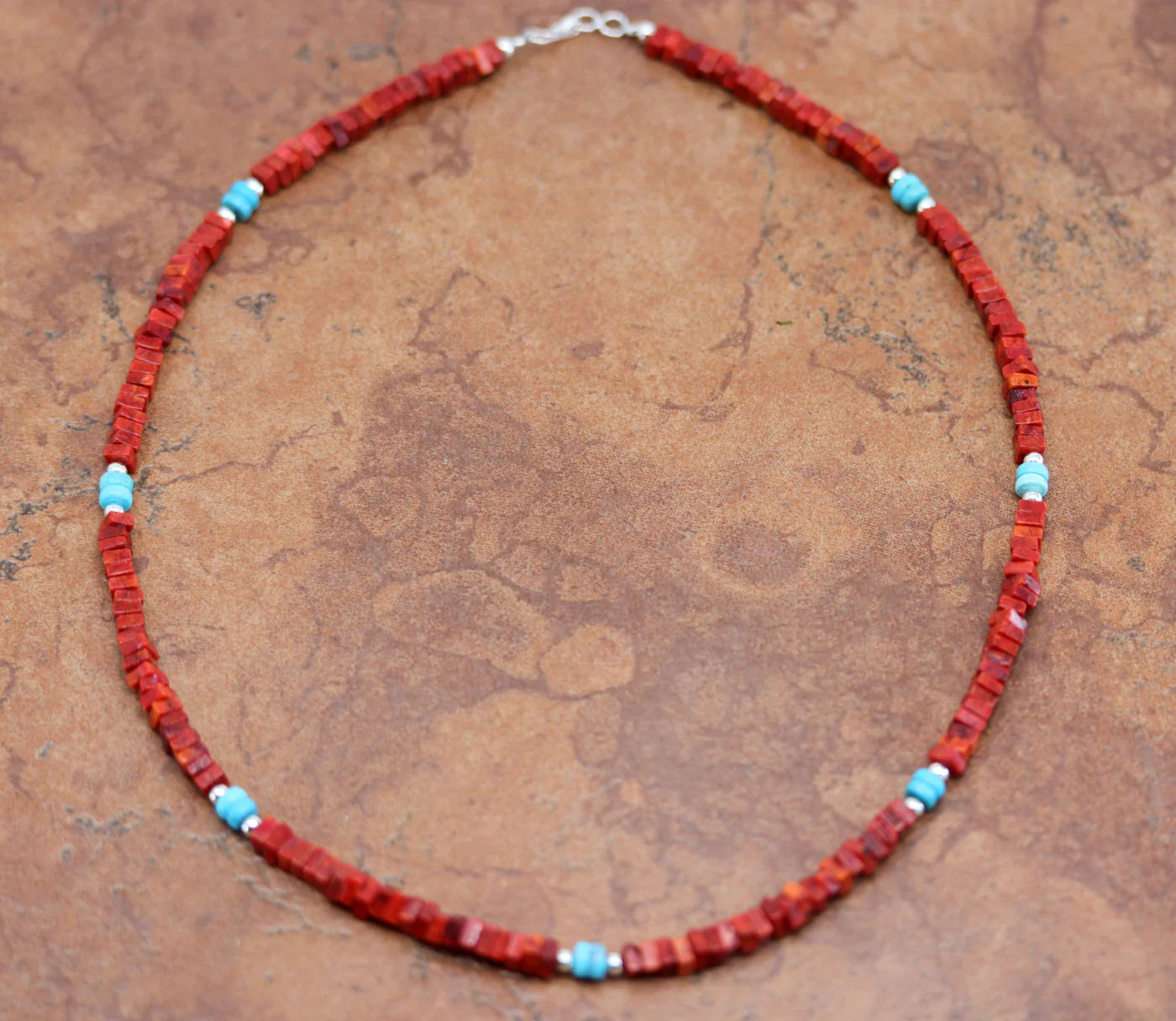 Sterling Silver Navajo Turquoise Coral Beaded Nugget Necklace