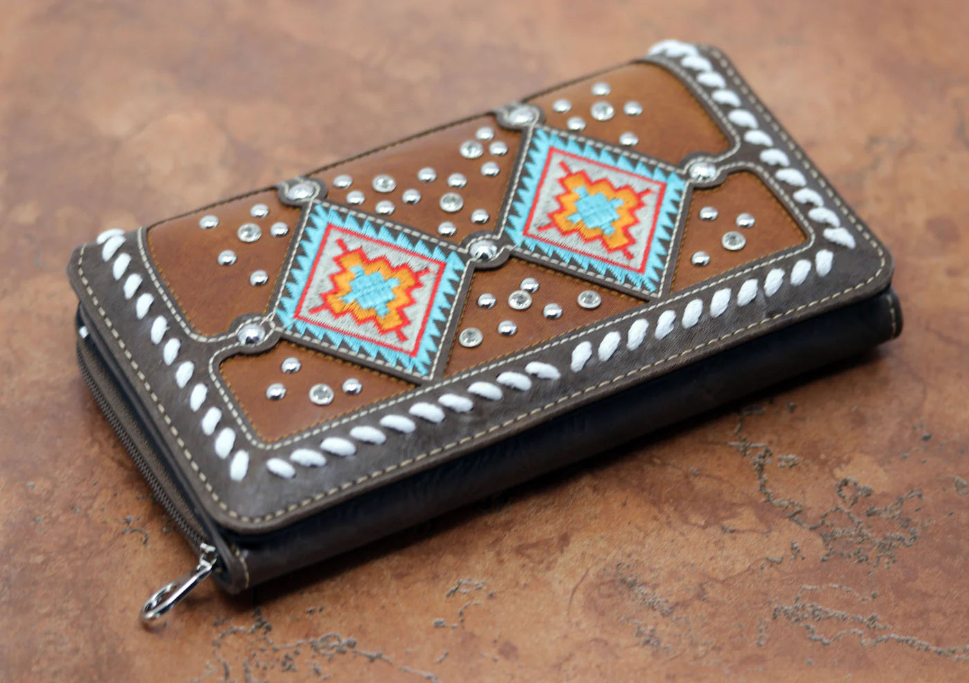 A beautiful, southwest pattern wallet. It is made from faux leather and man made turquoise. The bag measures 7 3/4" wide by 4 1/4" tall.