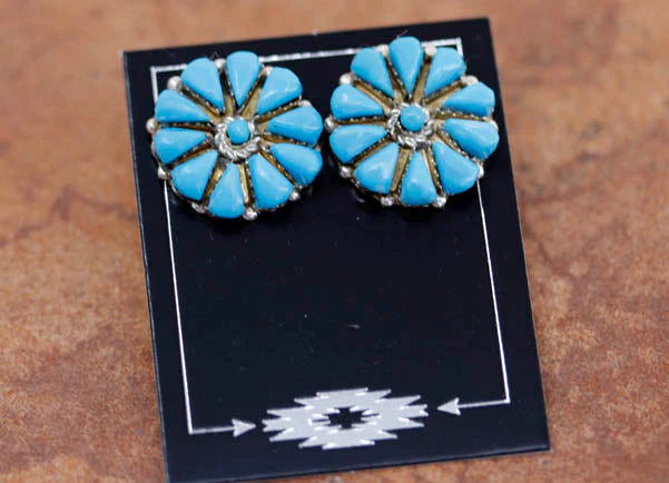 Authentic beautiful Navajo Native American cluster earrings. They are made from sterling silver and man made turquoise. The earrings are about 7/8" in diameter.